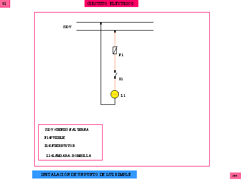 Este esquema representa el circuito básico del encendido de una lámpara de 220V. (60W…100W). En el circuito se incorpora un fusible para proteger de posibles cortocircuitos. El interruptor es para dar paso a la corriente o para cerrarlo, al mismo tiempo la lámpara se enciende al ser atravesado el filamento por la corriente.
