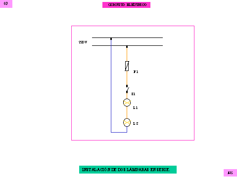 El esquema del circuito el encendido y apagado de dos lámparas en serie. El fusible protege a las lámparas de cualquier posible cortocircuito y el interruptor nos sirve para apagar o encender las lámparas desde cualquier distancia. Ten presente que al colocar dos lámparas en serie aumenta la resistencia de los filamentos por lo cual las lámparas lucirán menos. Cualquiera de ellas al quitarla apagará el circuito.