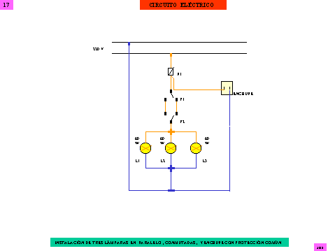 El esquema del circuito nos representa tres lámparas en paralelo con dos conmutadores y un enchufe.