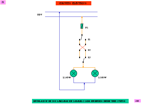 El esquema nos representa el funcionamiento de dos lámparas en paralelo, conmutadas o encendidas desde tres puntos.