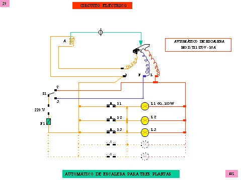El esquema del circuito nos representa un automático de escalera para tres plantas. El circuito va protegido por un fusible.