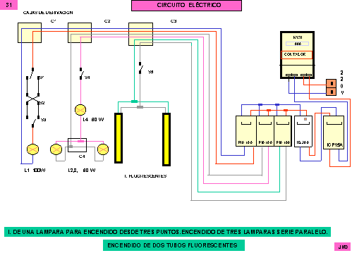 Instalación de dos timbres en paralelo con un pulsador. Instalación de dos tubos fluorescentes en paralelo e instalación de unas luces de emergencia con la caja y contador, el I.P.C. y los elementos necesarios de protección como Pías.
