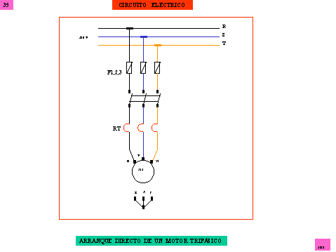 El esquema del circuito nos representa el arranque y funcionamiento de un motor a 380 V. El circuito al disponer de tres fases va protegida cada una de ellas con un fusible.