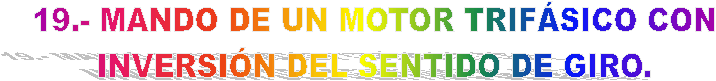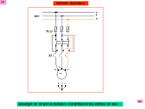 El circuito nos representa el funcionamiento de un motor en dos sentidos de giro. Todo el circuito va protegido por tres fusibles. Al arrancar el motor en un sentido (derecha o izquierda D-I) podemos, mediante la palanca , cambiar de posición y hacer que el motor nos gire en el otro sentido. La tensión aplicada es la total de 380V.