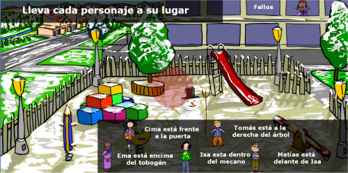 Se muestra el parque vacío, esta vez con un paisaje invernal. En la parte inferior aparecen los personajes acompañados de la descripción del lugar donde deben colocarse. Haciendo clic y arrastrando cada personaje, debemos situarlos en los lugares correctos. Escucharemos también una voz del locutor que describe esa situación.