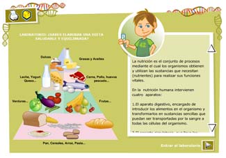 | Explicación esquemática del proceso de la digestión. | Nutrientes, tipos de alimentos, dietas equilibradas, etc. | Nutrientes, alimentos y dietas equilibradas. |
