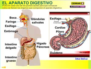 | Muy básico, para aprender los órganos y funciones. | Interactivo del aparato digestivo con actividades. |