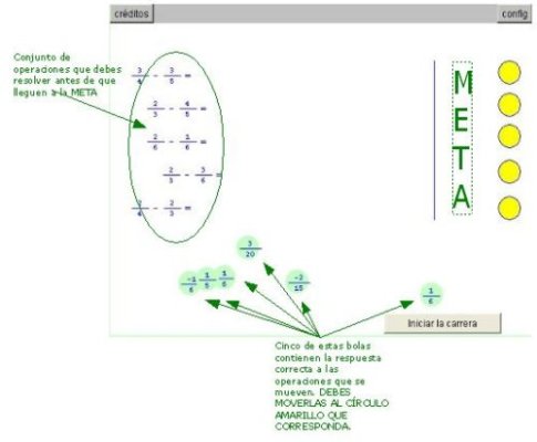 Objetivo. Efectuar sumas de fracciones con el mismo denominador. Procedimiento. En la parte izquierda se encuentran cinco operaciones que se desplazan horizontalmente buscando la META. Debes desplazar las bolas verdes a los circulos amarillos que corresponda con la solución de cada una de las operaciones antes de que lleguen a la META. Las bolas verdes contienen la fracción solución (o número entero) ya simplificada.