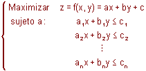 La función f(x,y) = ax + by + c llamada función objetivo y que es necesario optimizar. En esa expresión x e y son las variables de decisión, mientras que a, b y c son constantes.
